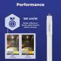 Ce tube LED T5 Noxion a un rendement lumineux (HO) très élevé, qui atteint 3900 lumen. La source lumineuse est donc parfaitement adaptée à l'éclairage efficace de grandes surfaces. Cela se reflète également dans l'efficacité du tube. Comment ? Ce tube T5 émet une lumière puissante de lumen pour chaque watt d'énergie consommé, ce qui est considérablement plus élevé que la valeur standard de 65. De plus, ce luminaire assure une distribution efficace de la lumière grâce à l'angle de diffusion de ° ; aucune lumière inutile n'est gaspillée au plafond, par exemple.