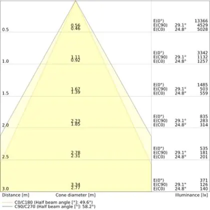 De gradenbundel geeft informatie over hoe breed het licht wordt uitgestraald. Dit zit tussen de 0 en 360 graden (D). Hoe kleiner de hoek, hoe specifieker de lichtbundel is. Over het algemeen is een smalle gradenbundel perfect voor sfeer- of accentverlichting, terwijl een brede gradenbundel ideaal is om grote oppervlaktes te verlichten.