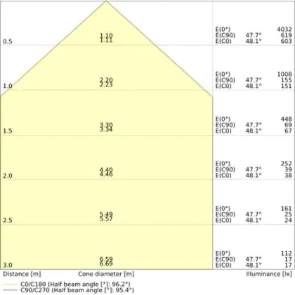 De gradenbundel geeft informatie over hoe breed het licht wordt uitgestraald. Dit zit tussen de 0 en 360 graden (D). Hoe kleiner de hoek, hoe specifieker de lichtbundel is. Over het algemeen is een smalle gradenbundel perfect voor sfeer- of accentverlichting, terwijl een brede gradenbundel ideaal is om grote oppervlaktes te verlichten.