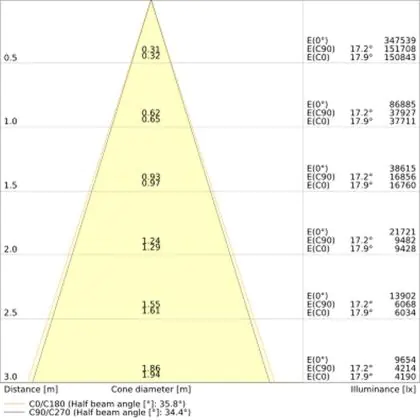 De gradenbundel geeft informatie over hoe breed het licht wordt uitgestraald. Dit zit tussen de 0 en 360 graden (D). Hoe kleiner de hoek, hoe specifieker de lichtbundel is. Over het algemeen is een smalle gradenbundel perfect voor sfeer- of accentverlichting, terwijl een brede gradenbundel ideaal is om grote oppervlaktes te verlichten.
