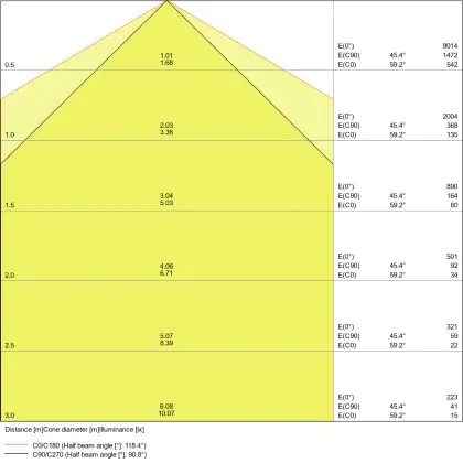 De lichtopbrengst (Lumen), geeft weer hoe krachtig het uitgestraalde licht is. Dit is belangrijk om te weten om de juiste sfeer te creëren. 0 tot 400 Lumen is bij uitstek geschikt voor accent- of sfeerverlichting. Een hoger aantal Lumen is, afhankelijk van de grootte van de ruimte, beter geschikt als ondersteunende- of basisverlichting. Heb je plafonds hoger dan 4 meter, dan is een lichtopbrengst van minimaal 8000lm aan te raden indien heldere verliching gewenst is (vb. in werkomgevingen).